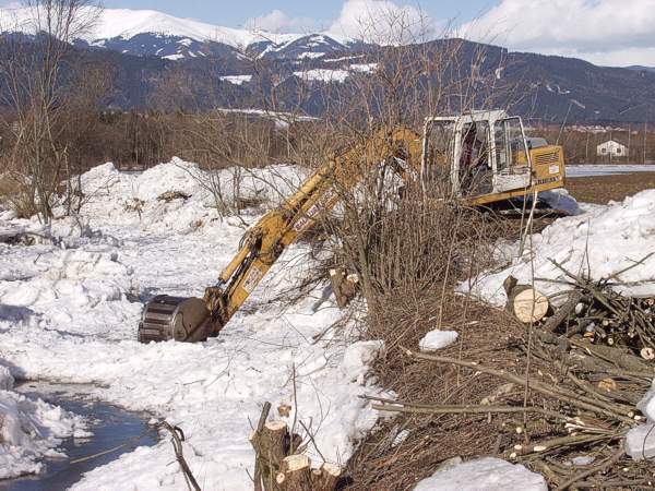 zu verhindern wurde mit Baggern versucht das Eis zu brechen und dem Wasser