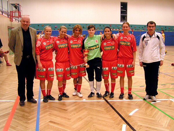 Therme Aqualux Futsal-Hallencup in FohnsdorfEibegger Installationen bezwingt Stella Rossa Tipp 3 Wien mit Markus „Magic“ Aigner Hallenfußball der Sonderklasse gab es in der Sporthalle Fohnsdorf. 10 Herrenteams und 6 Damenmannschaften spielten um den Titel des Therme Aqualux Futsalmeisters und um Preisgeld von 700 Euro. Turnierfavorit Stella Rossa Tipp 3 mit dem Bundesligaspieler und zweifachen Hallenkönig der Wiener Stadthalle, Markus „Magic“ Aigner, und Eibegger Installationen Fohnsdorf, ident mit der Kampfmannschaft von AT&S Techmo Fohnsdorf, gingen ungeschlagen in das Finalspiel. Und auch im Finale gab es nach der regulären Spielzeit von 2 x15 Minuten ein 3:3 und keinen Sieder. Also musste das Penaltyschießen entscheiden. Dort hatte das Team Eibegger Installationen das Glück auf seiner Seite und verlies das Fohnsdorfer Hallenparkett als Sieger. Auf Rang 3 landete Aquavital Fohnsdorf vor dem Gehörlosensportzentrum Graz. Therme Aqualux Futsalcup Fohnsdorf Endstand: 1. Eibegger Installationen Fohnsdorf 2. Stella Rossa Tipp 3 Wien 3. Aquavital Fohnsdorf 4. Gehörlosensportzentrum Graz 5. Cafe Central Fohnsdorf 6. Il Gelato Fohnsdorf 7. AT&S Techmo Fohnsdorf U-17 8. HAK International Klagenfurt 9. Salzstiegl 10. Top Dancing Gabriel Liezen ![]() Sieger des Therme Aqualux Hallencup in Fohnsdorf: Eibegger Installationen mit Rene Schaffer, Hannes Loderer, Andreas Kaus, Alexander Tscharre und Obmann Ing. Gerhard Grünanger (stehend von links) sowie Werner Gebhart, Stefan Pichler, Rene Zisser und Jürgen Klösch (hockend von links) Bei den Damen setze sich das Team von Stella Rossa Tipp 3 Girls vor der Bundesligamannschft des DFC Leoben und dem Veranstalterteam DFC AT&STechmo Fohsndorf durch. Therme Aqualux Futsalcup Fohnsdorf – Damenmannschaften Endstand: 1. Stella Rossa Tipp 3 Girls Wien 2. DFC Loeben I 3. DFC AT&S Techmo Fohnsdorf 4. USV Kobenz 5. DFC Loeben II 6. St. Lorenzen/Knittelfeld ![]() Das Damenteam von Stella Rossa Tipp 3 Girls gewann bei den Damenmannschaften ungeschlagen den Therme Aqualux Futsalcup in Fohnsdorf. Am Bild das Siegerteam mit Futsal-Austria Obmann Alfred Schloyer (links) und AT&S Techmo Fohnsdorf Obmann Ing. Gerhard Grünanger. ![]() Die Damenmannschaft des AT&S Techmo Fohnsdorf erreichte den 3. Rang beim Therme Aqualux Hallencup in Fohnsdorf. am Bild die Damenmannschaft mit Trainer Günter Linzatti, Jasmin Simbürger, Eva Landschützer, Stefanie Holzer (stehend von links)) sowie Srah Rußheim, Kerstin Url und Eva Widenschek (sitzend von links) Fotos. Tscharre |